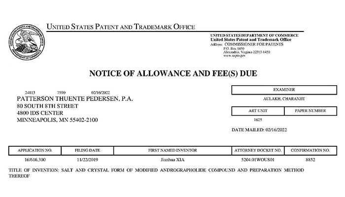 珍寶島藥業(yè)獲得穿心蓮內酯改構化合物美國專利授權通知書