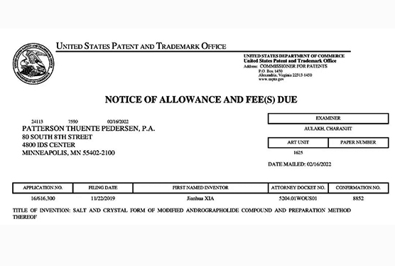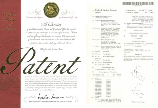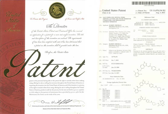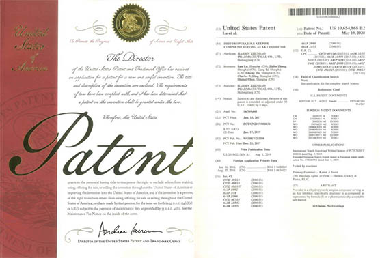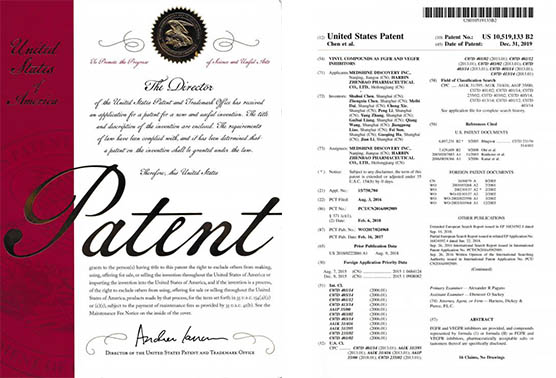 國內發(fā)明專利通過PCT途徑,創(chuàng)新藥在多個國家獲得專利授權,《作為FGFR和VEGFR抑制劑的乙烯基化合物》已獲得美國、歐洲、日本授權;《作為Akt抑制劑的二氫吡唑氮雜卓類化合物》已獲得美國、歐洲、日本、韓國授權;《作為Akt抑制劑的鹽型及其晶型》已獲得美國、日本、韓國和歐洲授權;《穿心蓮內酯改構化合物》獲得美國授權;《一種穿心蓮內酯改構化合物的鹽型、晶型及其制備方法》已獲得美國、歐洲授權;《一種作為FGFR和VEGFR抑制劑化合物的鹽型、晶型及其制備方法》已獲得美國、歐洲、日本授權。